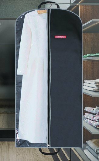 | Плюсы: | Полностью закрытый чехол для одежды. Внутри крепкая петля для вешалки, сверху петля для подвески в шкаф. |