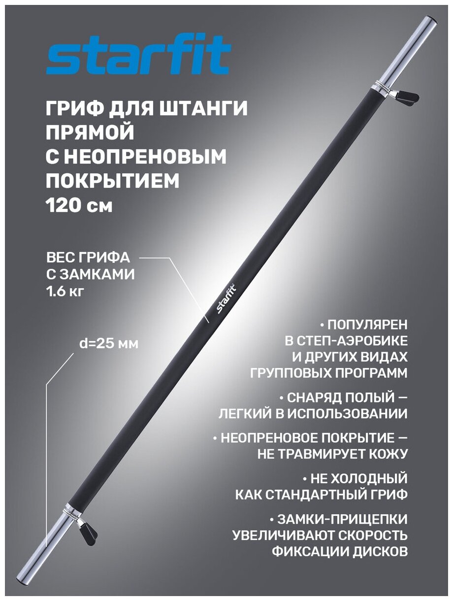 СохранитьГриф для аэробики STARFIT BB-104 120 см, d=25 мм, неопреновый, с пружинными замками, черный интересное: