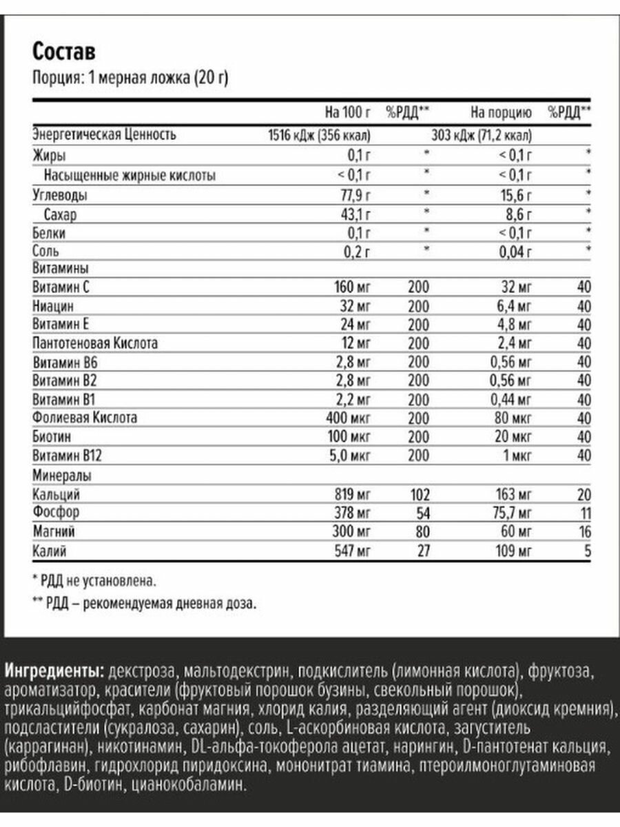 | Плюсы: | Приятный вкус ( кисло-сладкий, если хочется менее насыщенный - модно уменьшить порцию порошка на 500 мл воды), хорошо растворяется, хорошо восполняет потери углеводов на интенсивной тренировке, без негативного влияния на жкт. Всё индивидуально, конечно! Рекомендую к использованию ?? |