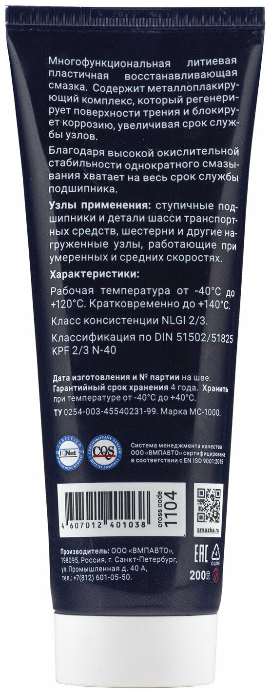 Смазка литиевая 200гр - МС 1000: универсальная для подшипников и деталей шасси, восстанавливает поверхности, защищает от трения, от-20С до+140С, NLGI 3, черная, тюбик