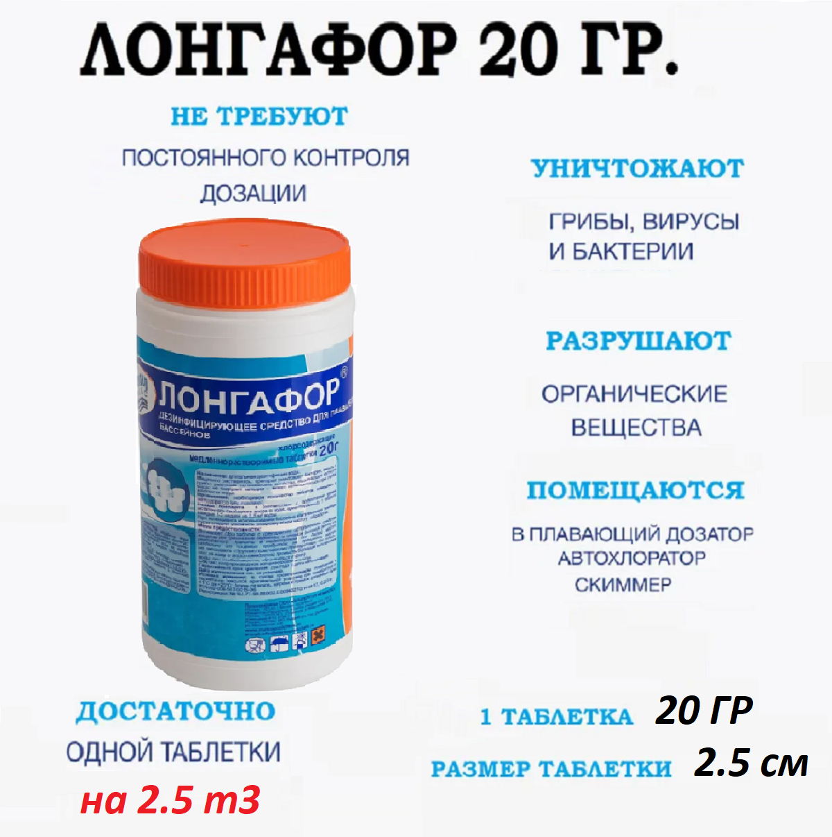 Дезинфицирующее средство"Лонгафор" таблетки 20 г, для воды в бассейне, банка, 1 кг Маркопул Кемиклс .
