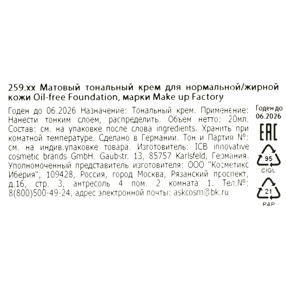 MAKE UP FACTORY Крем тональный матовый для нормальной и жирной кожи, 21 светлый мокка / Oil-free Foundation