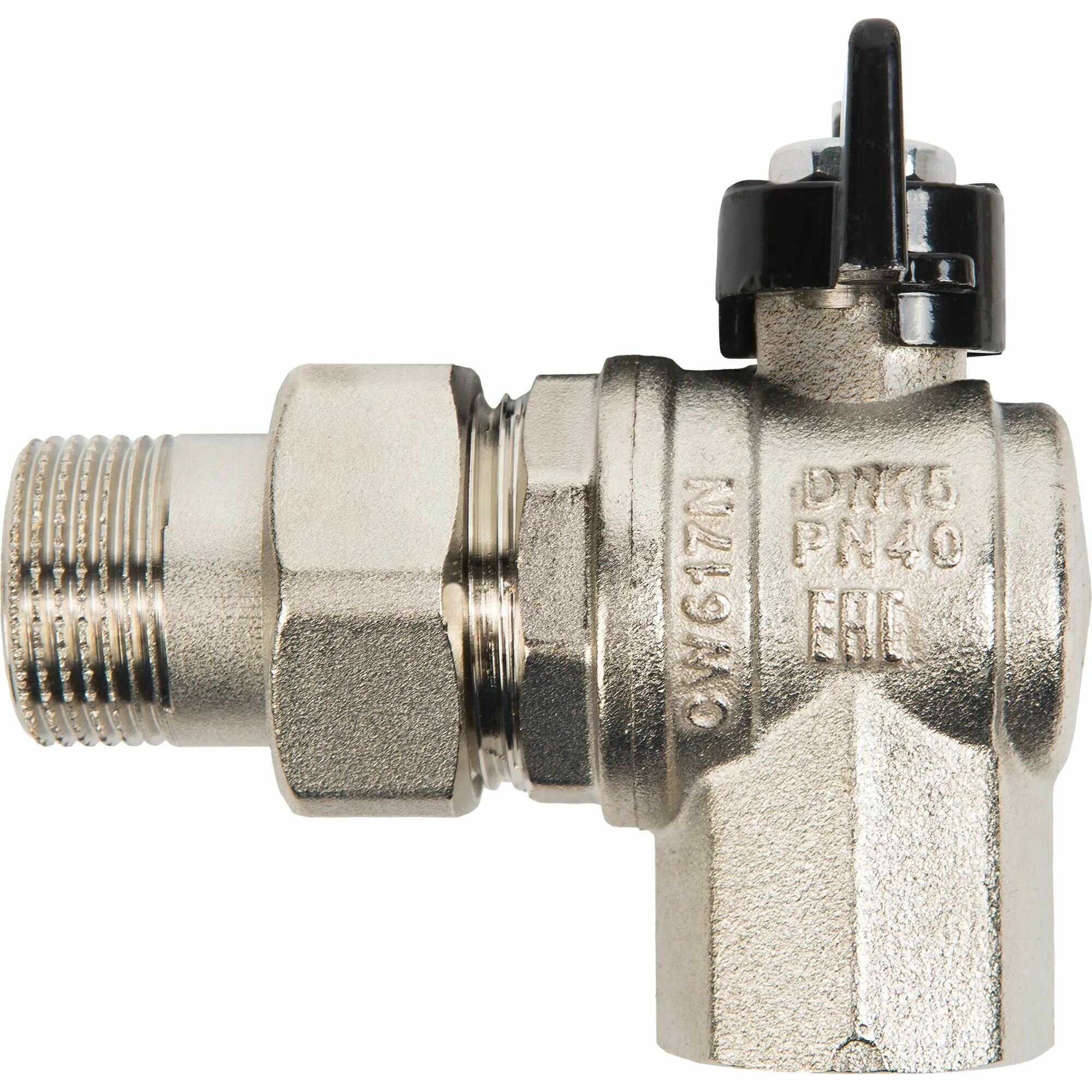 Кран шаровой полнопроходной угловой Bugatti Oregon 594 - 1/2' (ВР/НГ, PN40, ручка-бабочка черная) 05940001