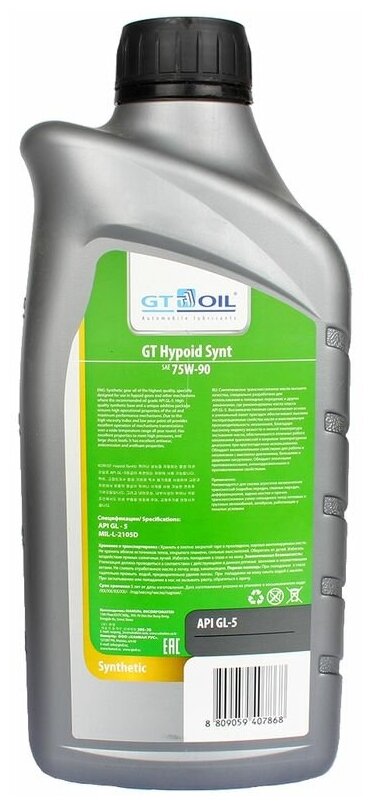 GT OIL Масло Hypoid Synt, SAE 75W-90, API Gl-5, 1л 8809059407868 .