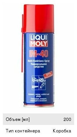 Ниже Вы можете прочитать отзывы на Смазка LIQUI MOLY LM 40 Multi-Funktions-Spray 0.2 л, ознакомится с подробными характеристиками, посмотреть интересные обзоры и фотографии на Смазка LIQUI MOLY LM 40 Multi-Funktions-Spray 0.2 л.