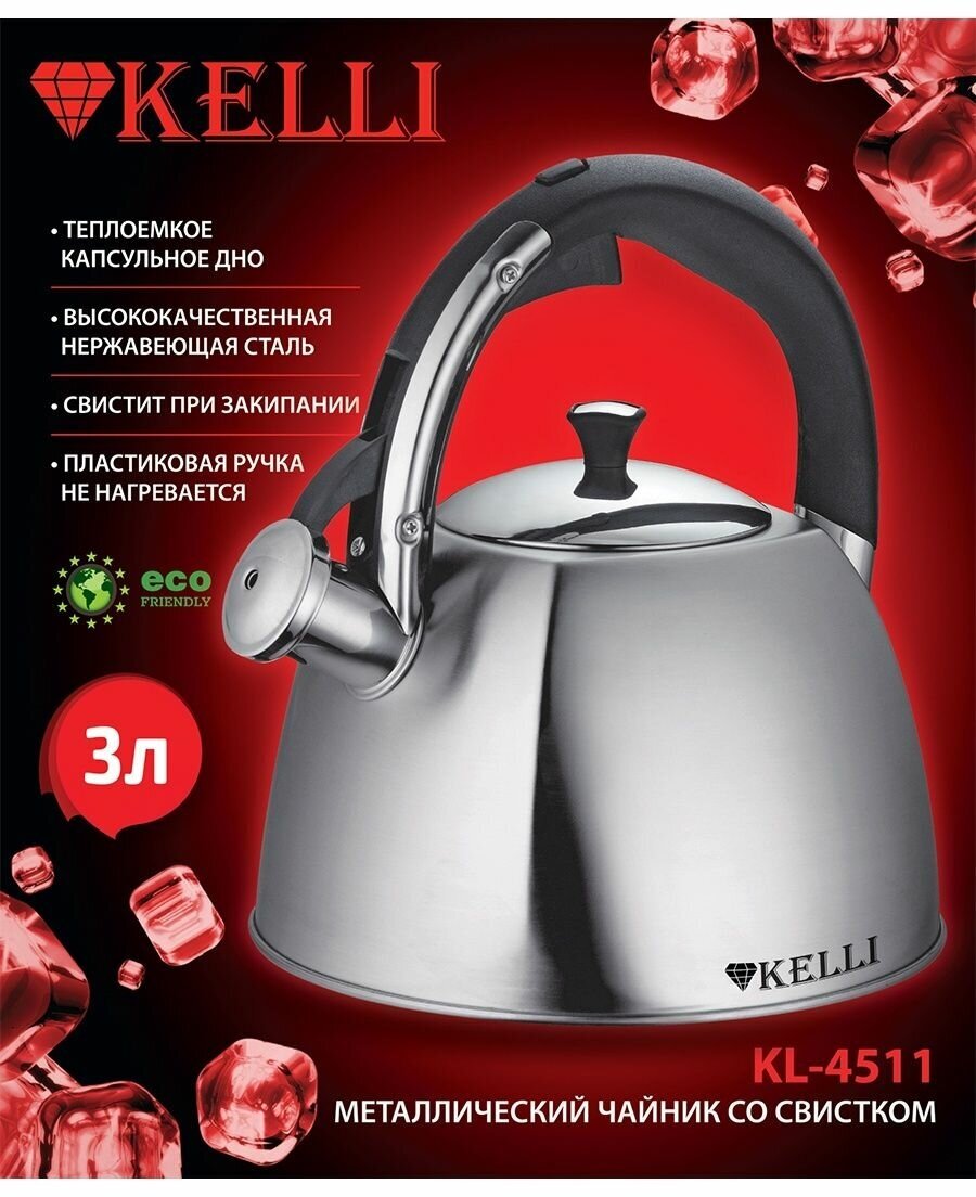 Чайник для плиты со свистком Kelli KL-4510/KL-4511 3 л, серебристый
