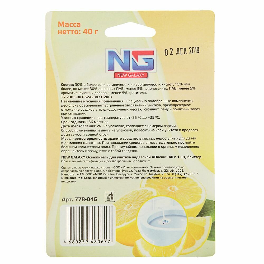 Освежитель NEW GALAXY для унитаза подвесной 40 гр,1 шт, блистер. Лимон /778-046/