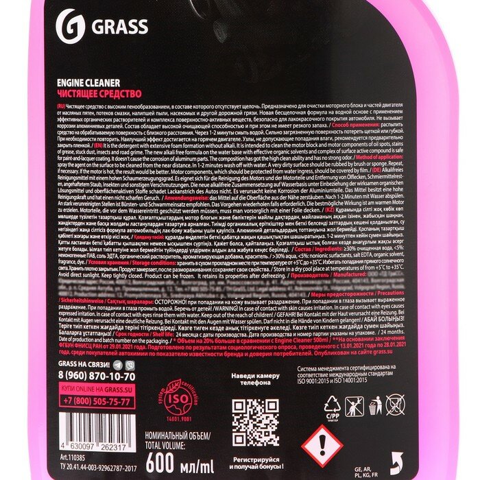 GRASS 110385 Очиститель двигателя 600мл - Engine Cleaner для очистки моторного блока и частей двигателя от масляных пятен, потеков смазки и другой грязи, готов к применению, спрей