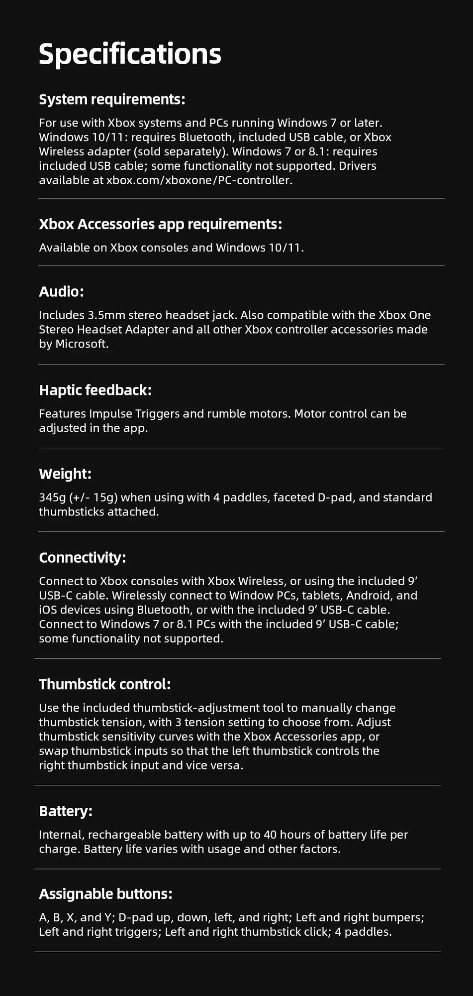 | Особенности | подключение к консолям Xbox с помощью технологии Xbox Wireless, беспроводное подключение к компьютерам с Windows 10, планшетам и Android с помощью Bluetooth |