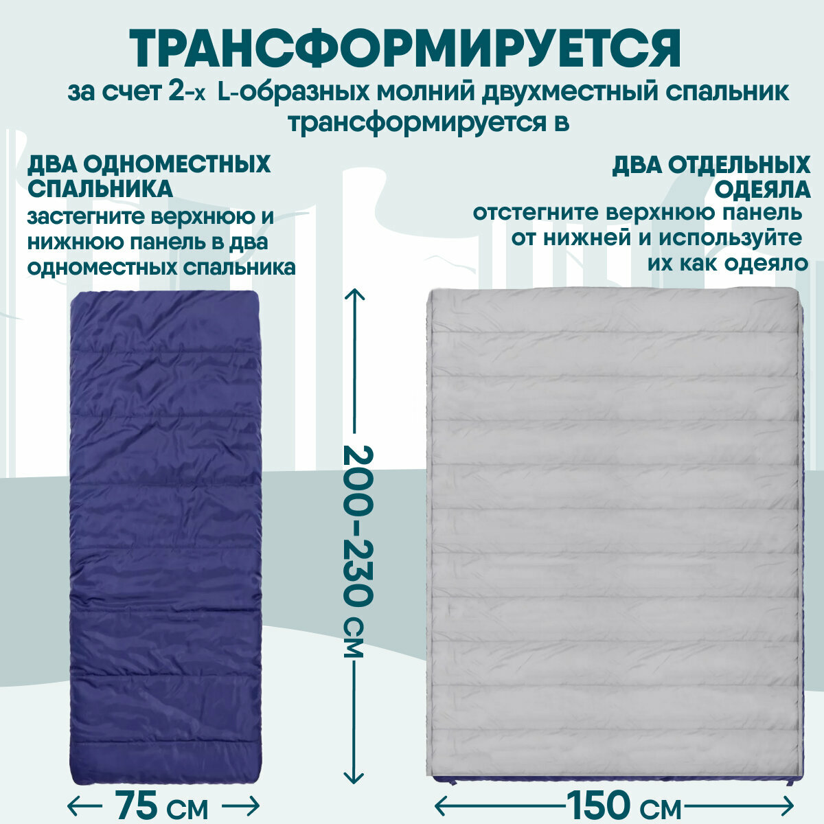 | Плюсы: | Ткань, вес, качество швов, возможность разделить на два отдельных спальных мешка. |