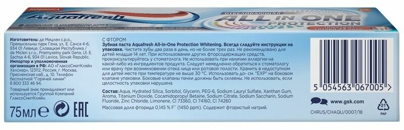 Aquafresh Зубная паста All-in-One Protection Whitening, 75 мл интересное: