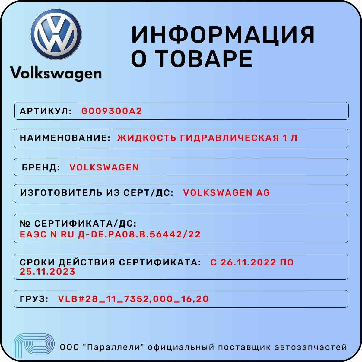 Жидкость гур, 1л Vag G009300A2 интересное: