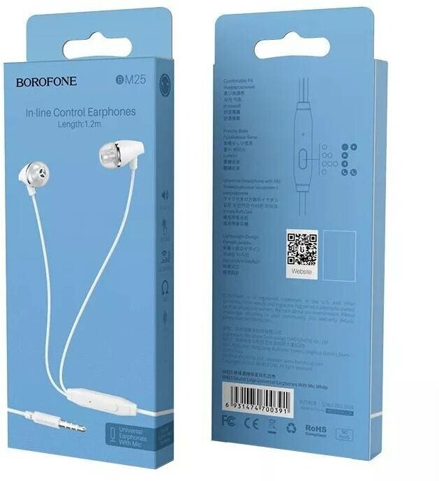 Проводные наушники BOROFONE BM25 Sound edge, Jack 3.5mm, 1.2 м, белый