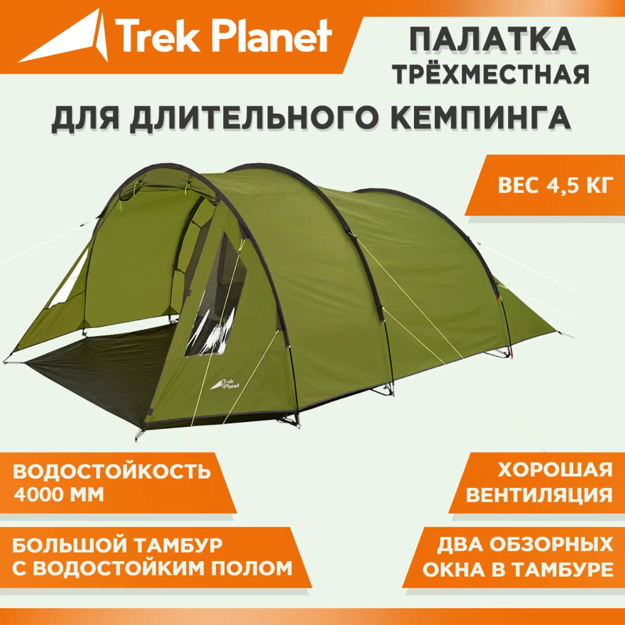 Палатка TREK PLANET Ventura 3-местная зеленый 205x(225+155)x135 см 70211