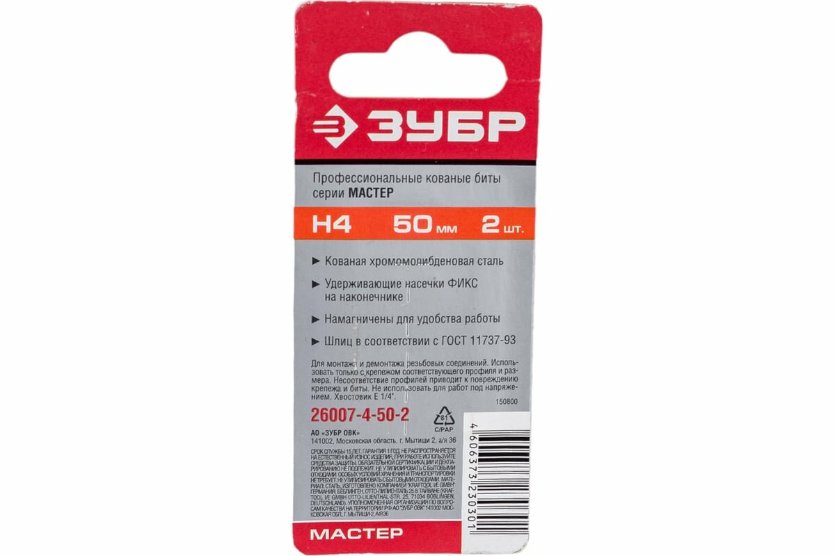 Биты ЗУБР Мастер HEX4-50мм (2шт) 26007-4-50-2