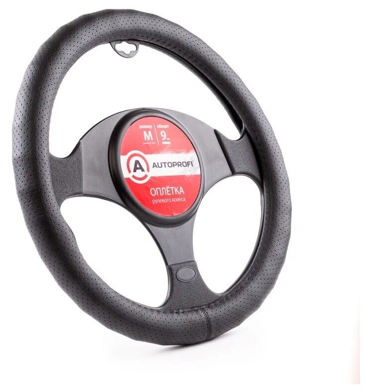Купить Оплетка на руль AUTOPROFI M 38см с увелич. обхватом 9 см, экокожа перфорир, ребристая основа, черная