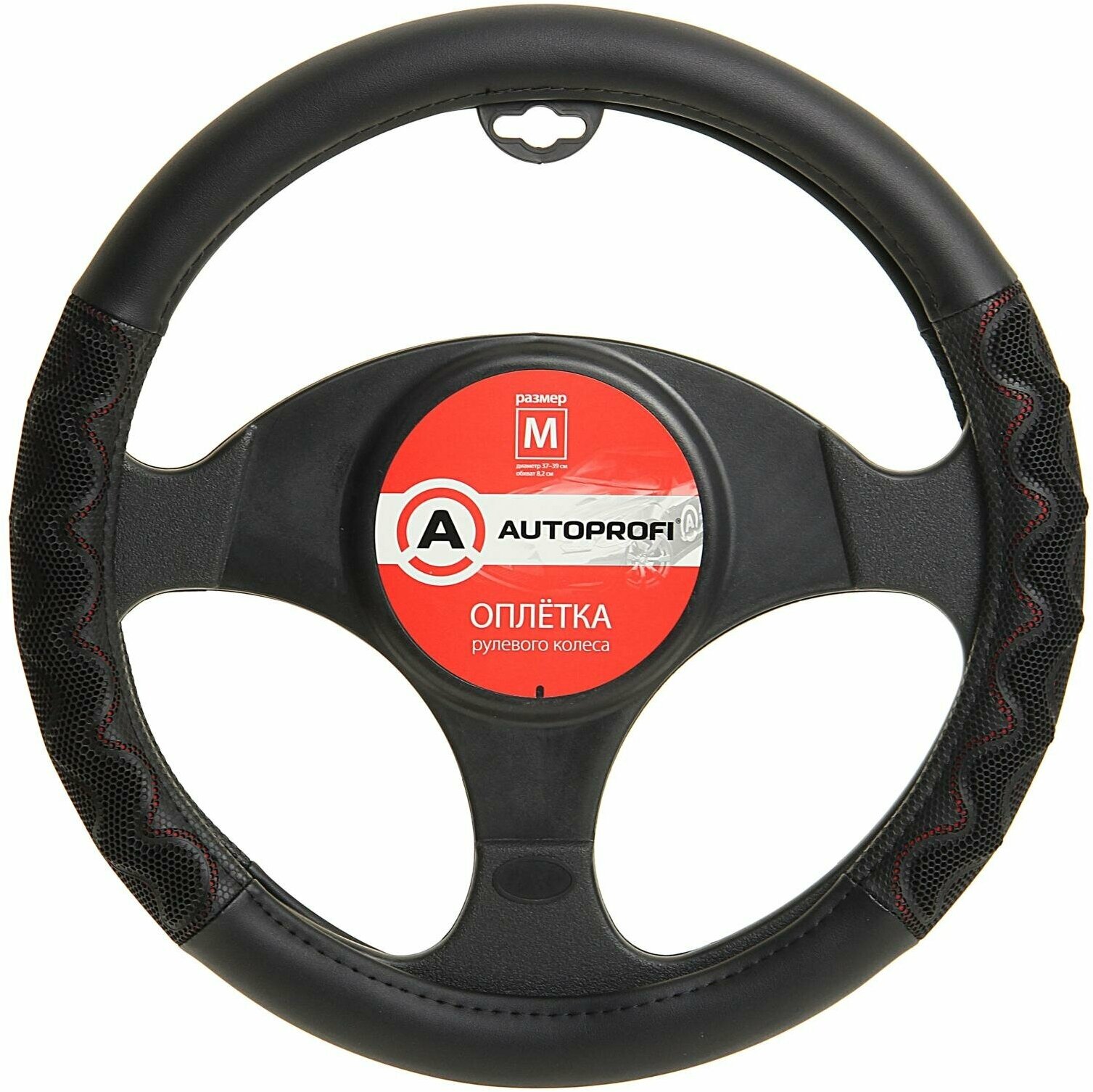 Оплётка руля "AUTOPROFI", экокожа, объемные вставки, (черный/красный) (М)