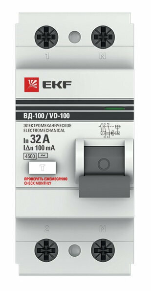Устройство защитного отключения УЗО ВД-100 2P 32А/100мА (электромеханическое) EKF PROxima elcb-2-32-100-em-pro