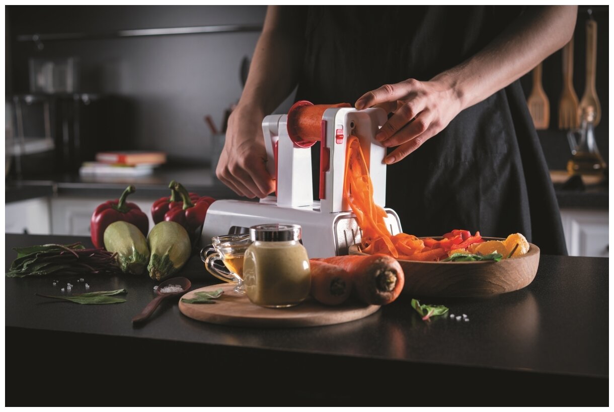 | Отзыв: | Интересная вещица. Она нужна не только для украшения блюд, с ее помощью можно можно делать спагетти из овощей и фруктов на любой вкус. Есть разные насадки по толщине спиралей. Брала себе, чтобы делать домашнюю морковку по-корейски.