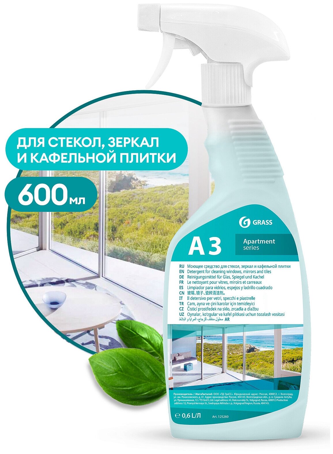 Средство моющее Grass Apartament series А3 для стекол, зеркал и кафельной плитки триггер 0,6 л