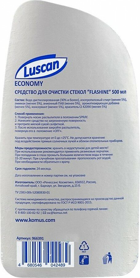 Средство для мытья стекол и зеркал Luscan Economy, флакон с распылителем, 500мл