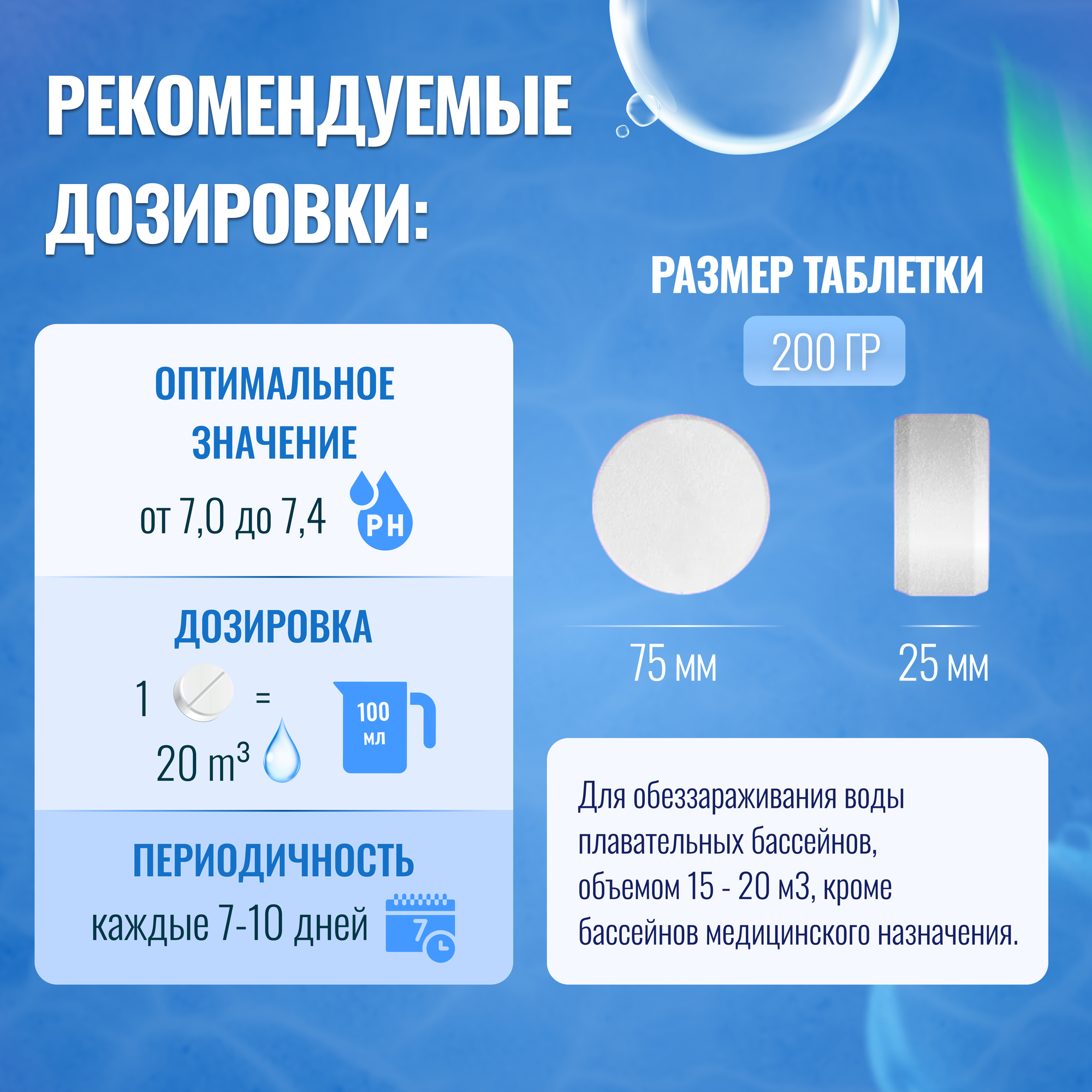 | Дополнительная информация | Таблетки без капсулы или скиммера в бассейн не бросать – опасность обесцвечивания материалов бассейна! |