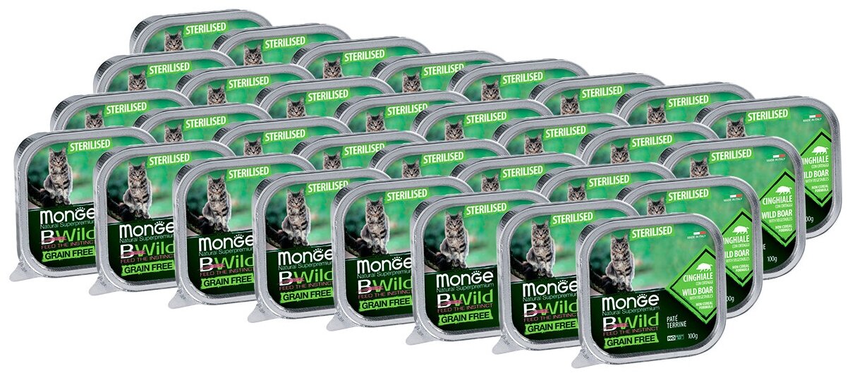 Влажный корм для стерилизованных кошек Monge BWILD Feed the Instinct, беззерновой, с кабаном, с овощами 32 шт. х 100 г (паштет)