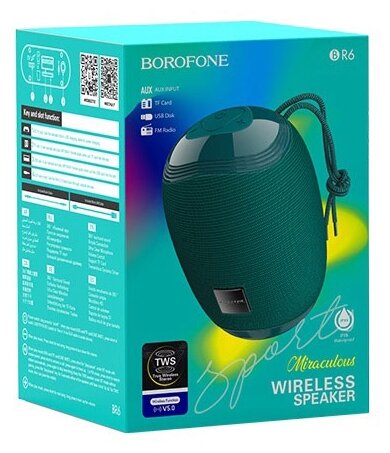 Беспроводная колонка Borofone BR6, Bluetooth, 5W, AUX, TF Card, USB, водонепроницаемый, зеленый, 1шт
