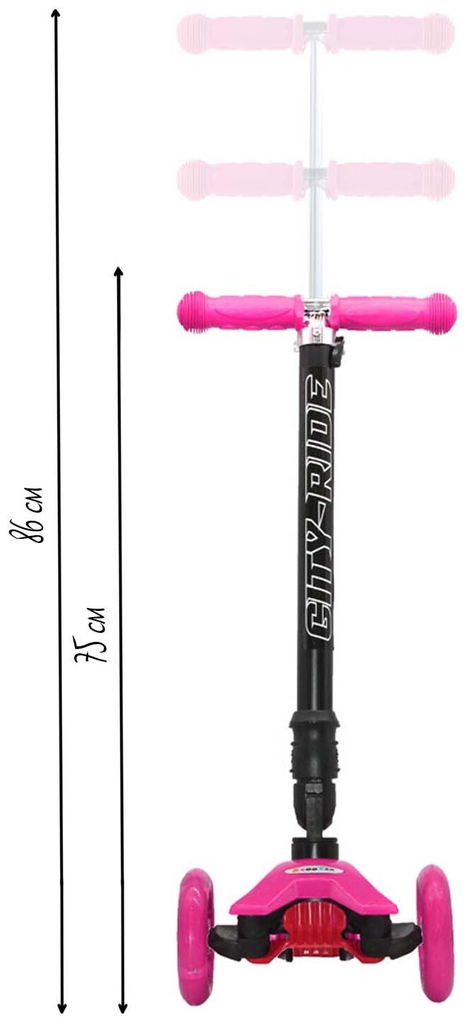 Самокат детский трехколесный ТМ CITY-RIDE, колеса PU 120/76мм со светодиодами, складной руль, телескопический, металлический, резиновые рукоятки, цвет розовый. Размеры: 55 х 22 х 86 см