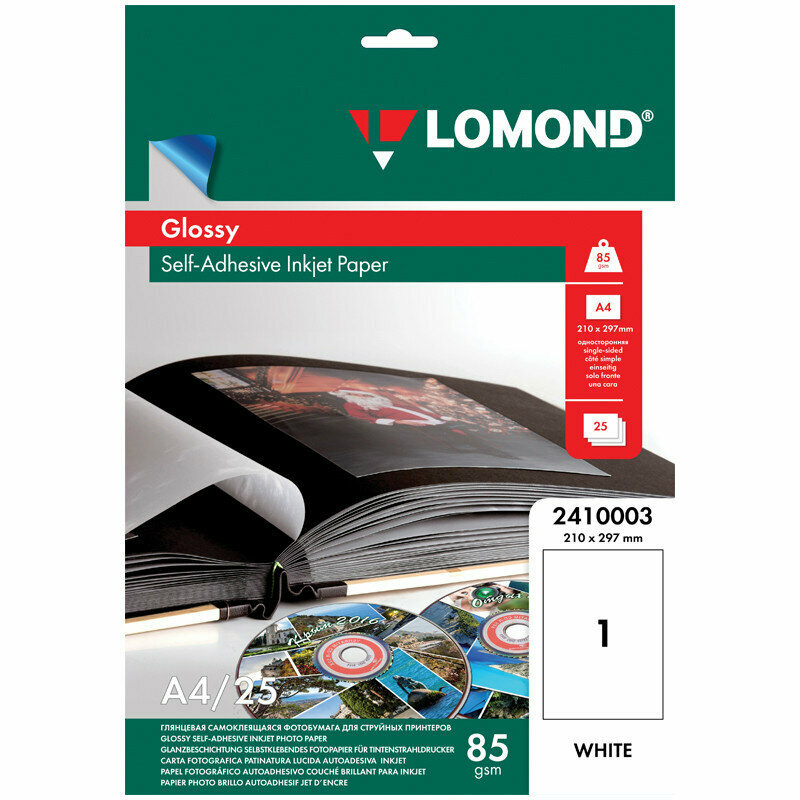 Lomond 2410003 A4 Струйная глянцевая самоклеящаяся фотобумага 85 г м2 Белизна: 0,95 25 листов в пачке