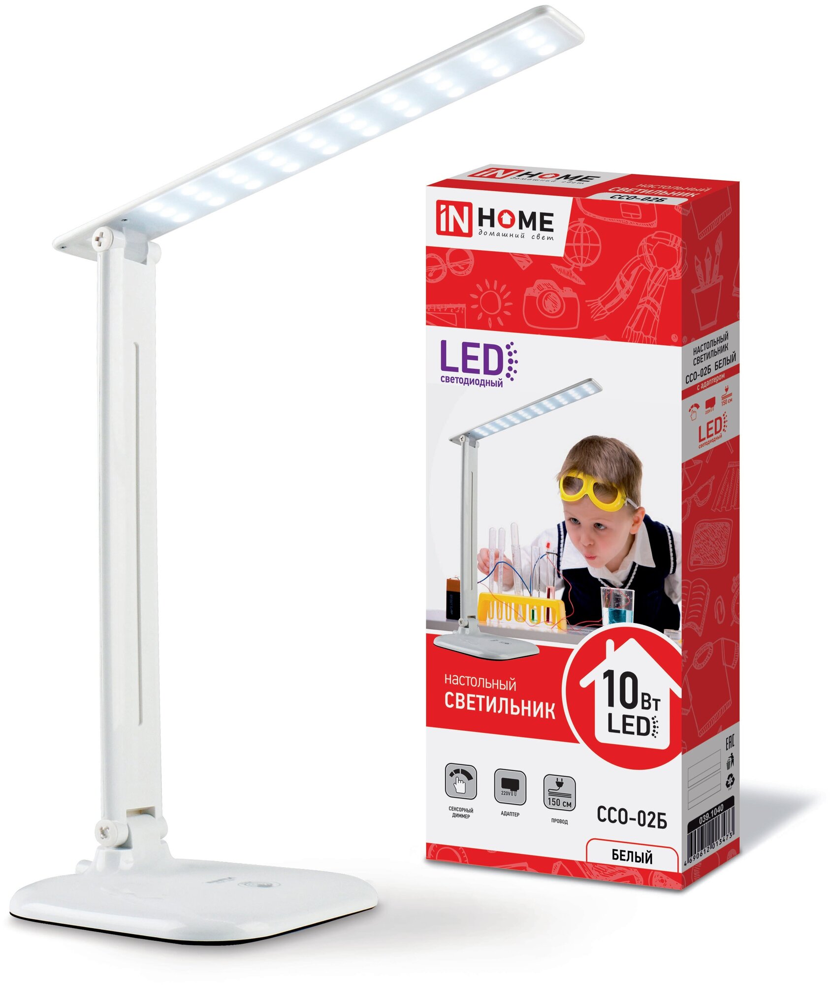 Светильник настольный светодиодный ССО 02Б 10Вт 4000К 625лм сенсор-диммер адаптер бел. | код. 4690612013473 | IN HOME ( 1шт. )