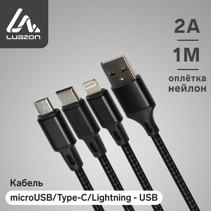 Luazon Home Кабель 3 в 1 LuazON, microUSB/Type-C/Lightning - USB, 2 А, 1 м, оплётка нейлон, черный
