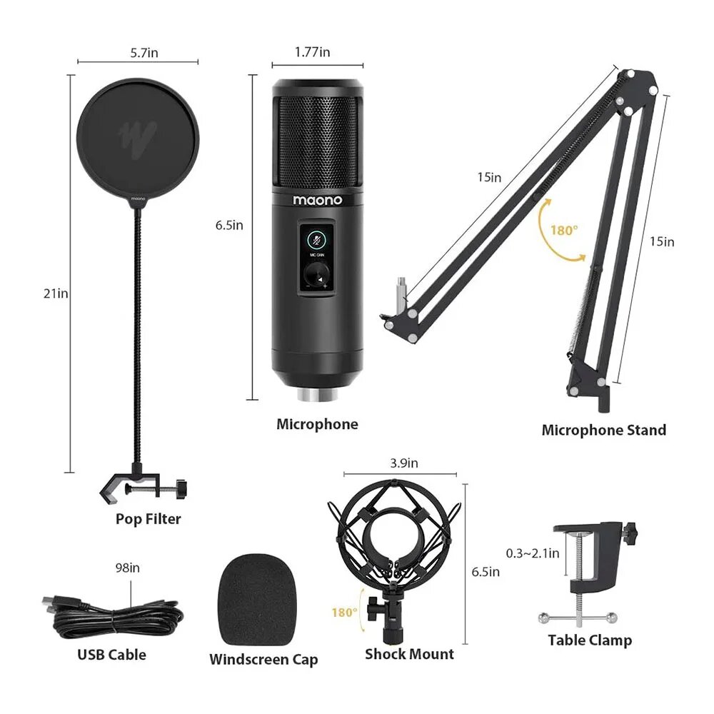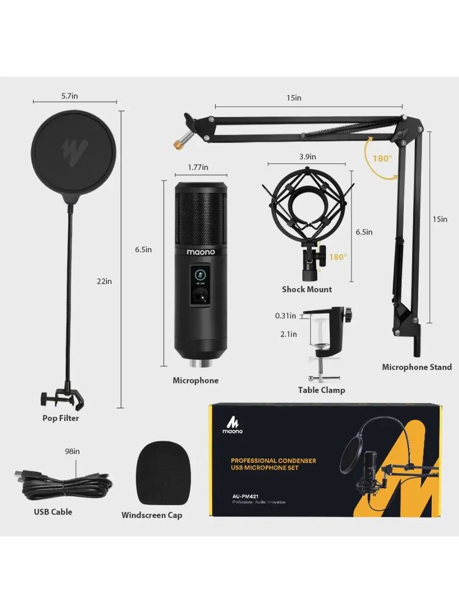 Maono AU-PM421 USB-микрофон, конденсаторный кардиоидный c кнопкой Mute и регулировкой чувствительности с пантографом, держателем "паук", поп-фильтром, ветрозащитой. Капсюль 16 мм., 20-20000Гц,-36дБ (±3 дБ), макс. SPL 125 дБ, 192 кГц. USB кабель, для Windo