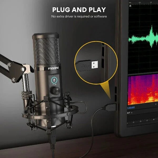Maono AU-PM421 USB-микрофон, конденсаторный кардиоидный c кнопкой Mute и регулировкой чувствительности с пантографом, держателем "паук", поп-фильтром,