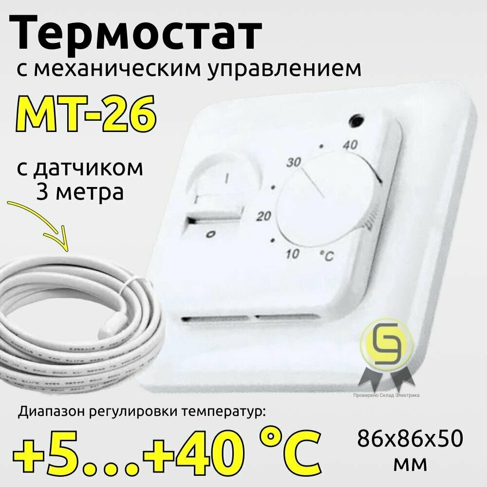 Термостат механический MT-26 (OTN-1991; RTC 70.26; MST-1; R70XT; MTT-2; M5.713) 16А 3.6кВт для теплых полов датчик пола бел. Extherm MT-26