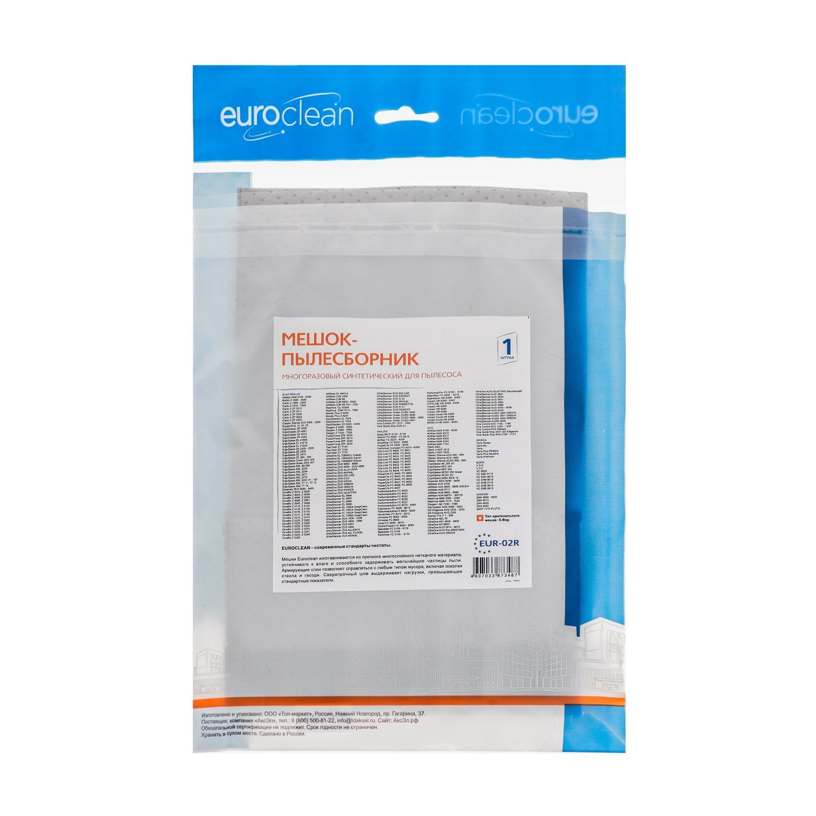 Многоразовый мешок-пылесборник EUROCLEAN EUR-02R для пылесосов ELECTROLUX, PHILIPS, AEG, 1 шт