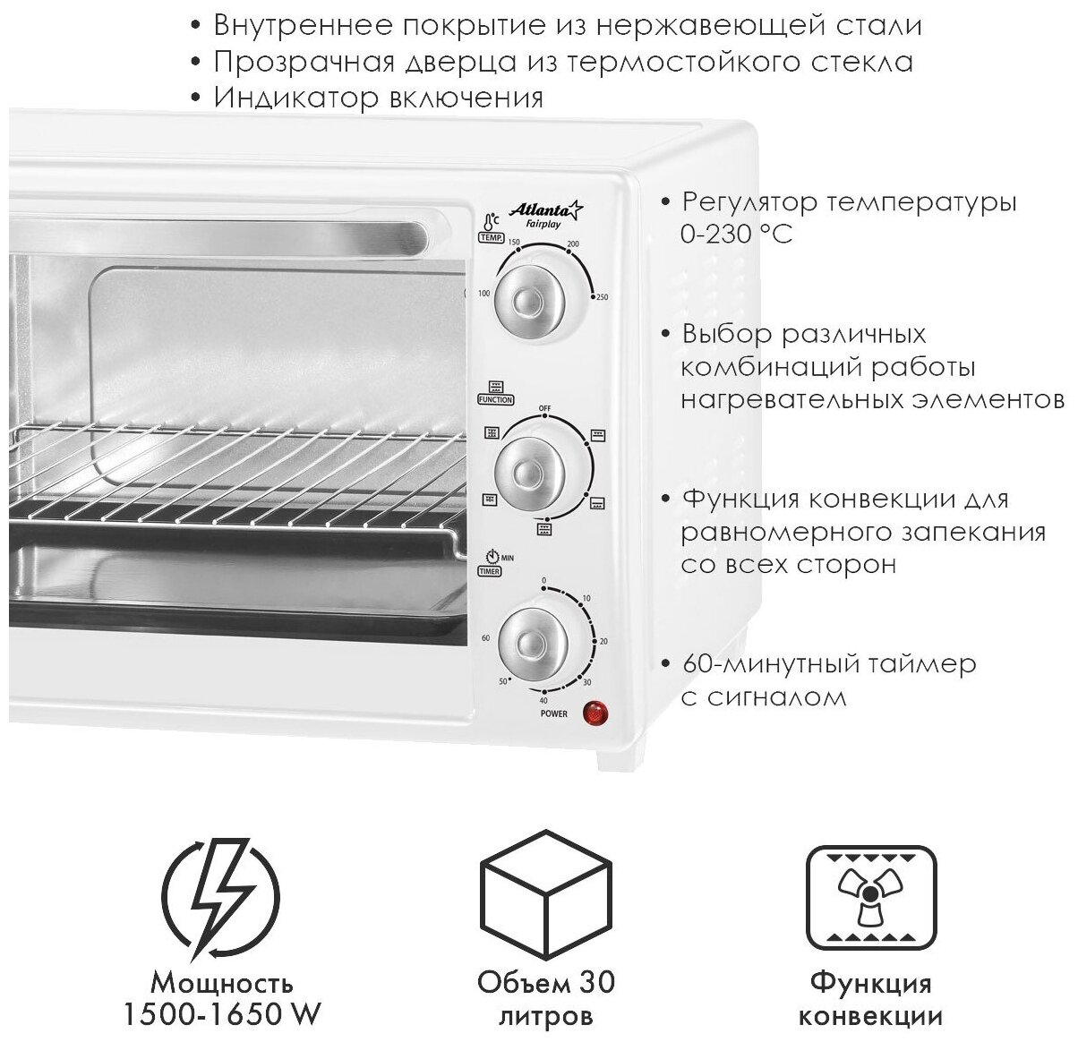 Мини печь Atlanta ATH-1407 (black), 1650 Вт, 30 л, конвекция, таймер с сигналом