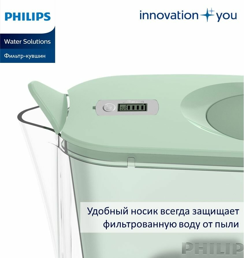 Кувшин для воды Philips AWP2938GNT/51 4 л, с фильтром для очистки воды, с откидной крышкой и цифровым таймером, скорость фильтрации 0,3 л/мин, носик с защитой от пыли