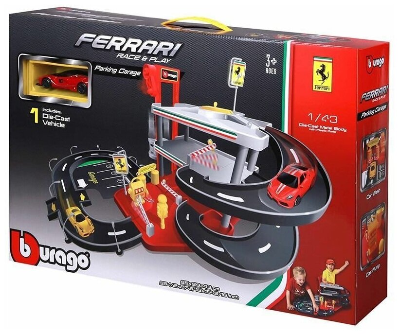 Купить BBURAGO "Паркинг 3-х уровневый BB 18-31204 1:43 FERRARI RACE & PLAY PARKING GARAGE с 2-мя коллекционными машинками, Красный"