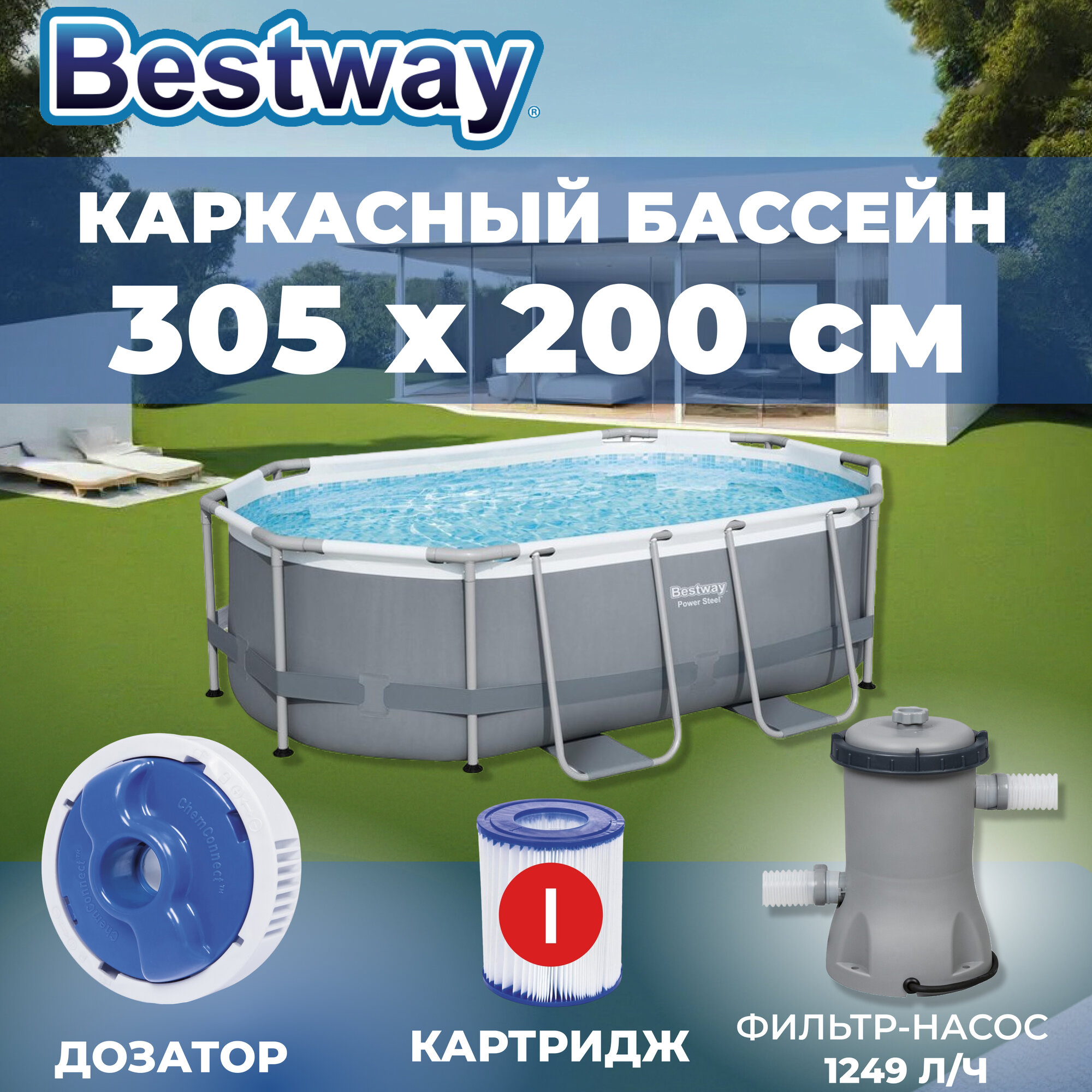 СохранитьБассейн каркасный Bestway, 305х200х84 см, Power Steel Oval Pool, 5614A, фильтр-насос, 3668 л, поплавок-дозатор интересное: