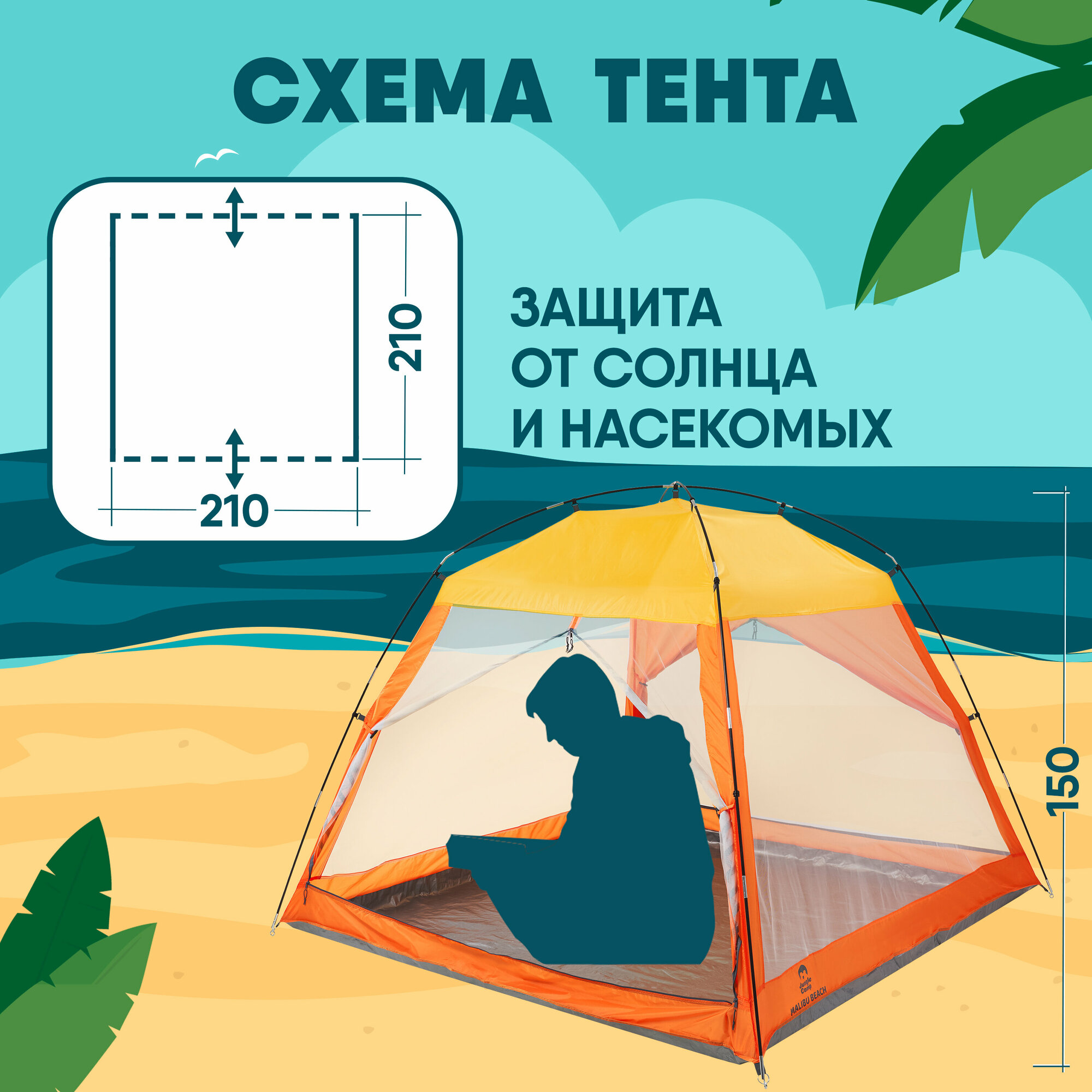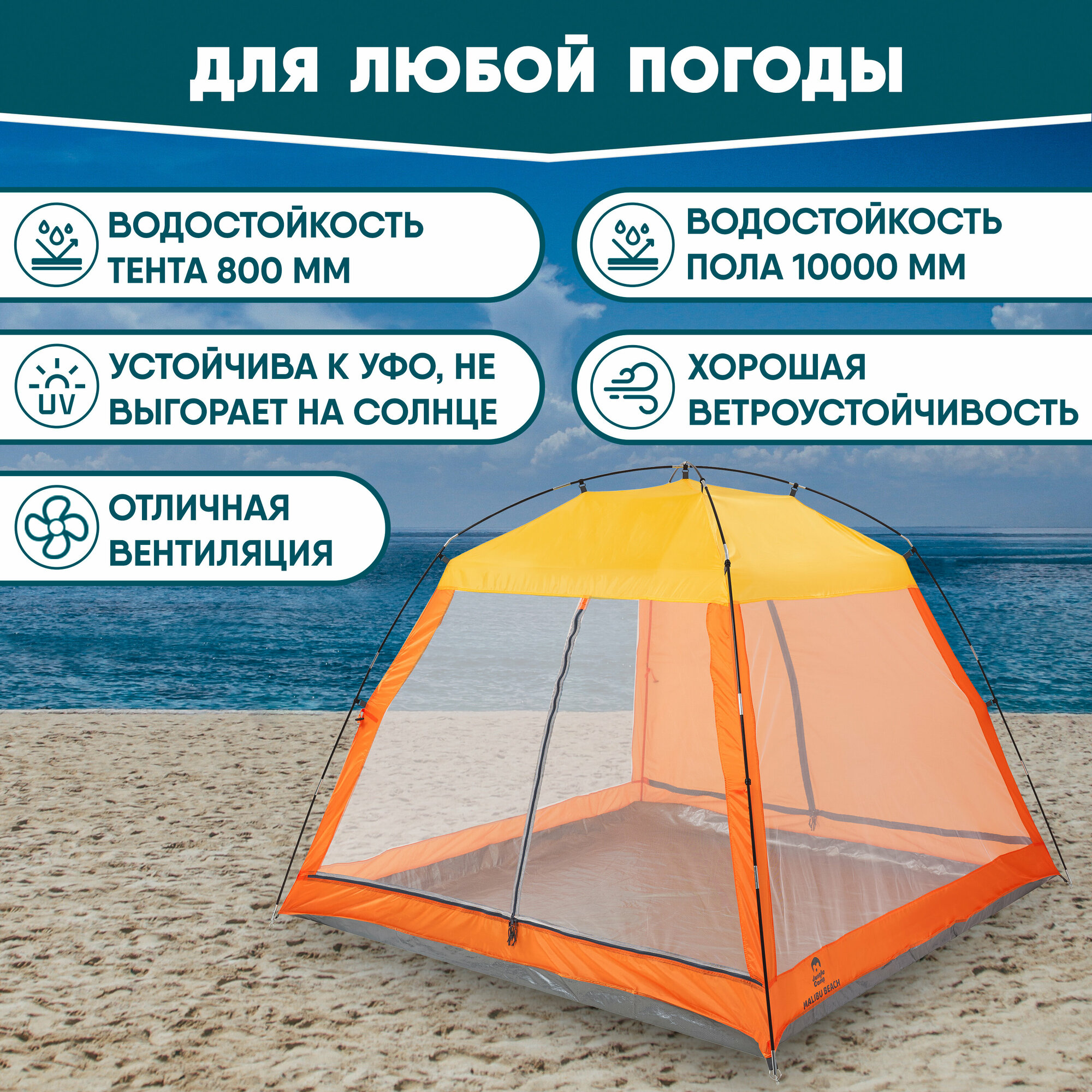 Тент пляжный JUNGLE CAMP Malibu Beach, жёлтый/оранжевый, 210 см х 210 см х 150 см