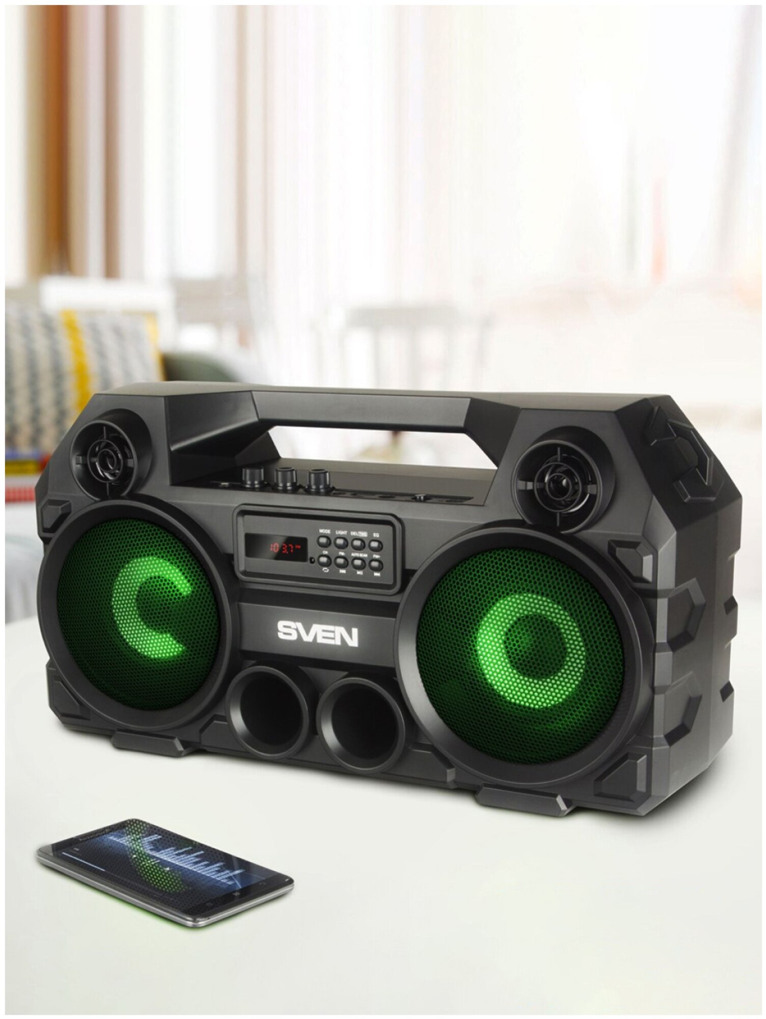 Колонка портативная беспроводная bluetooth SVEN PS-580, переносная с радио и ручкой для переноски / Колонка блютуз музыкальная акустическая с подсветкой / 36 Вт / TWS / USB / microSD / LED-дисплей / пульт / вход для караоке микрофона