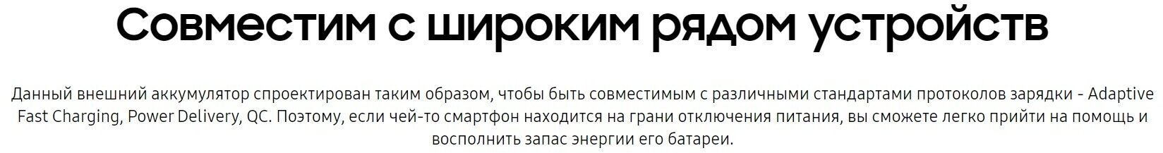 Поддерживает режим Super Fast Charging (по крайней мере для телефонов Samsung). Провод usb-c <-> usb-c, идущий в комплекте, короткий и не занимает лишнего места, что позволяет носить аккумулятор в одном кармане с телефоном |