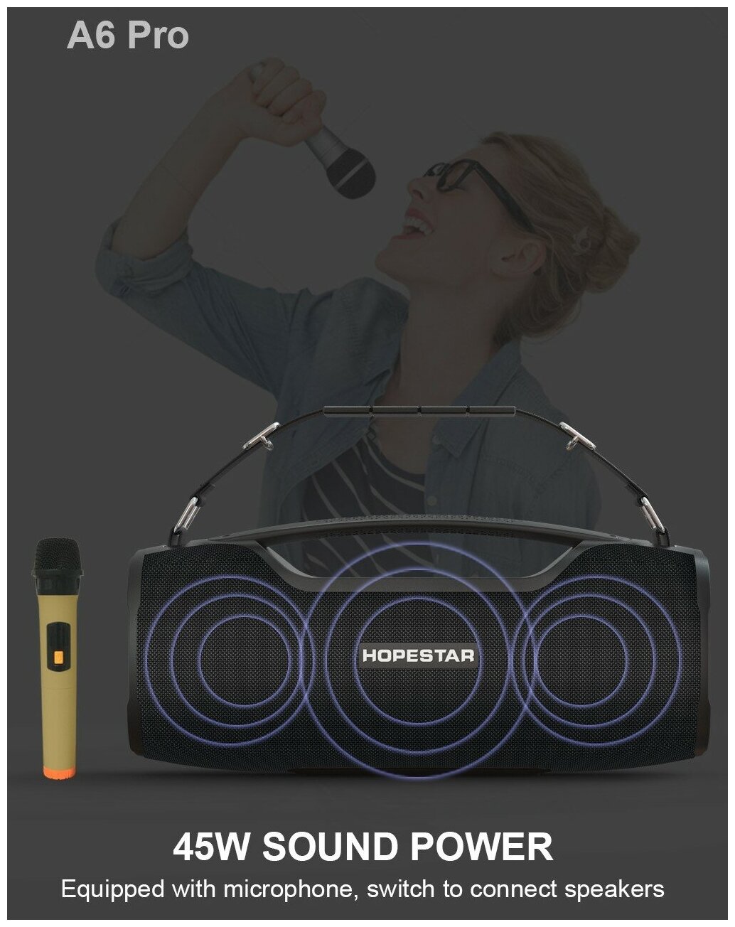 Портативная беспроводная Bluetooth колонка HOPESTAR A6 PRO + микрофон / 55 Вт / Портативная караоке система, черная