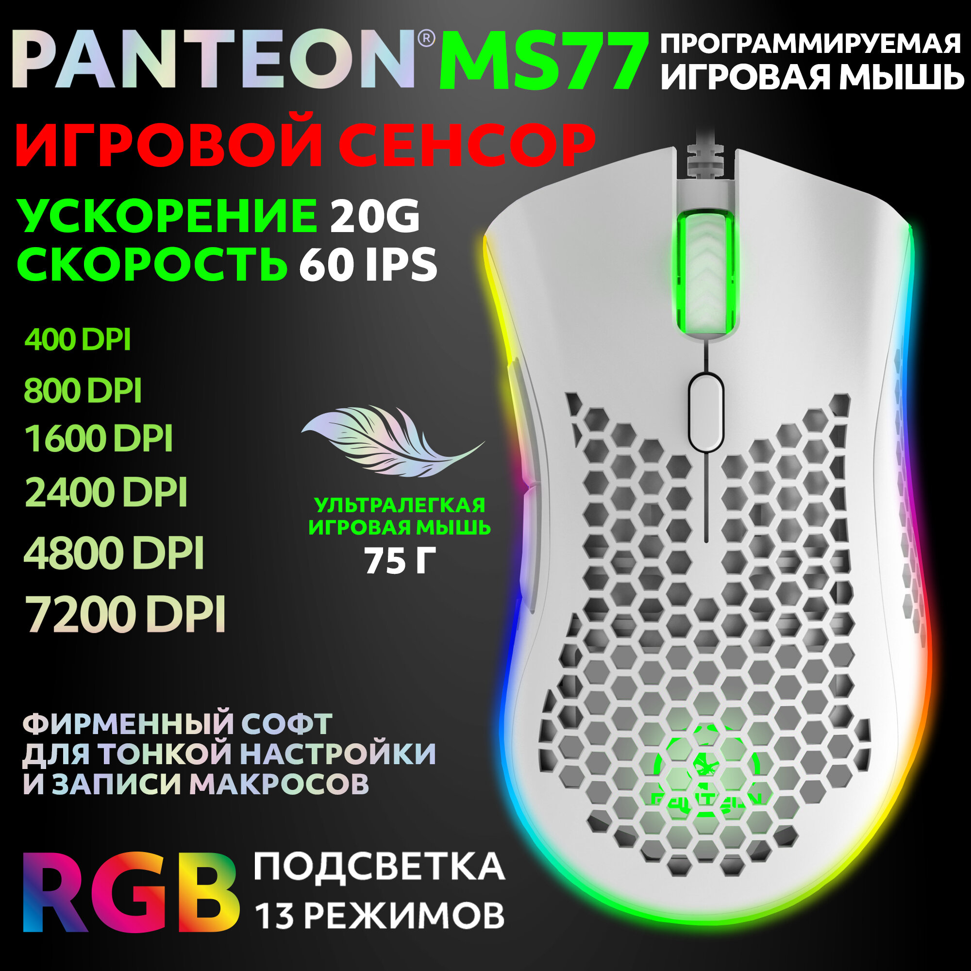 Купить Игровая программируемая мышь с подсветкой LED CHROMA LIGHT JETACCESS PANTEON MS77 белая (INSTANT 725 c микроконтр., 60 IPS/20G, 200-7200 dpi, 6 кнопок, LED 10 режимов, кабель 1.8м,USB)