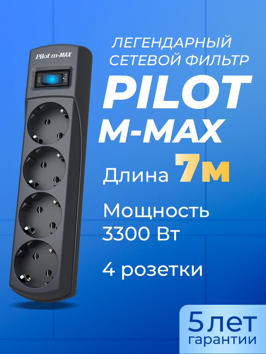 Сетевой фильтр Pilot m-Max 7 метров, черный, 4 розетки