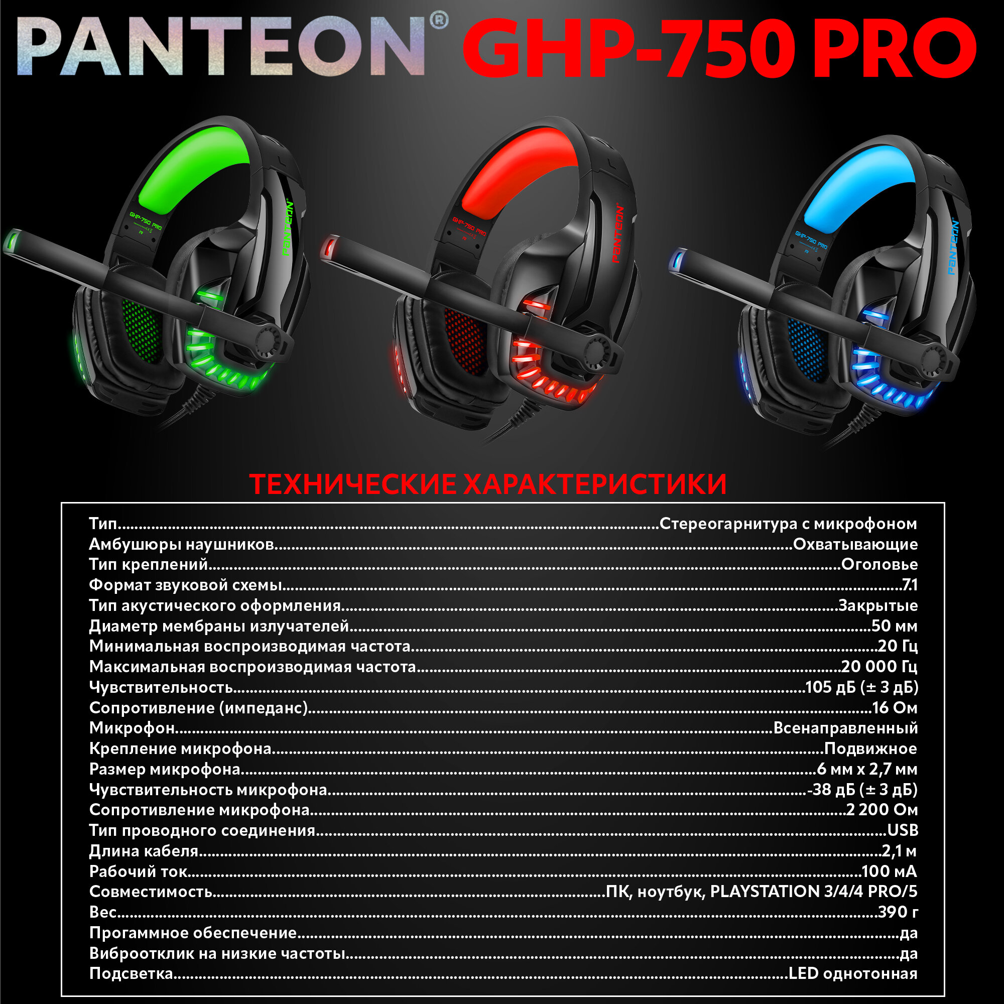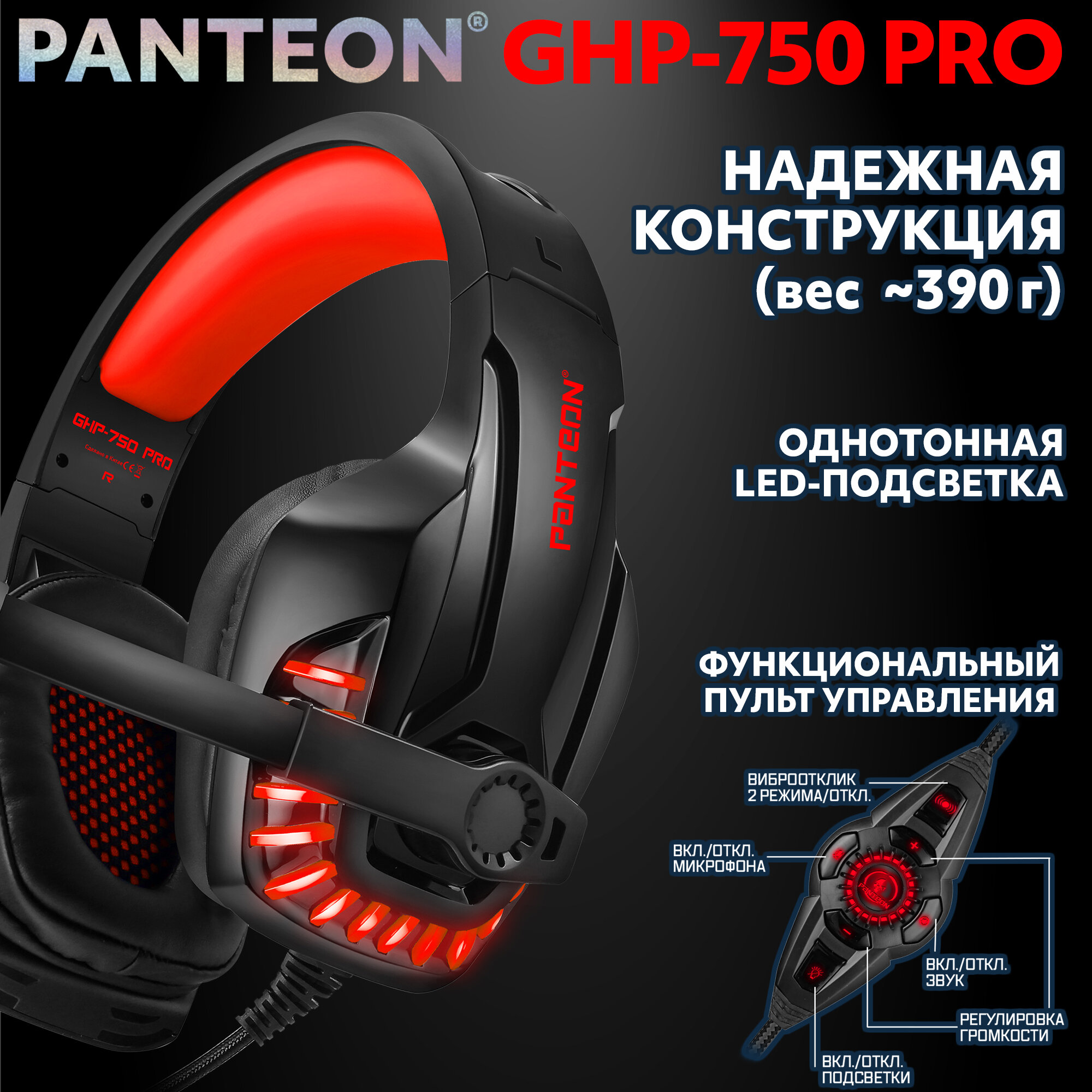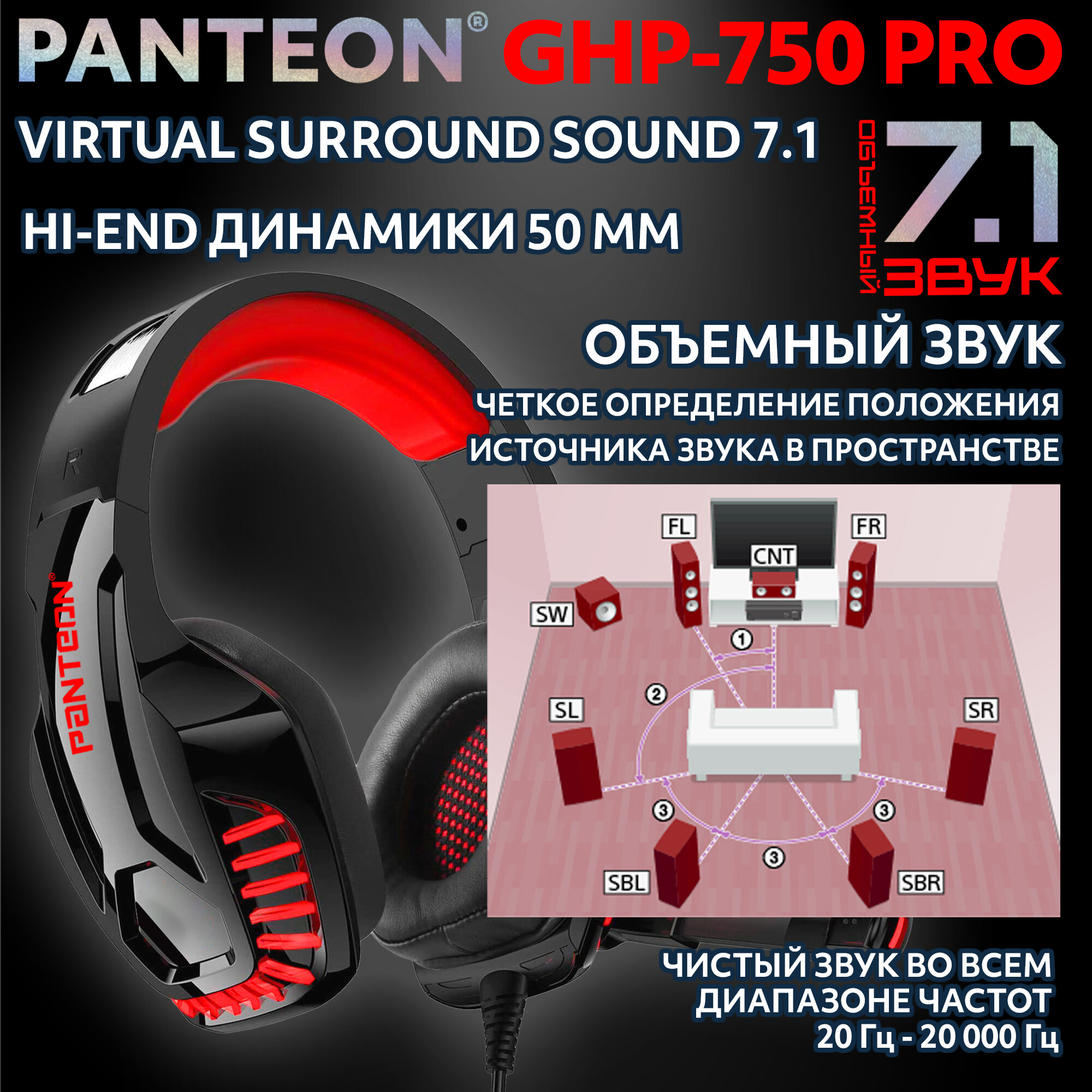 Игровые наушники с микрофоном JETACCESS PANTEON GHP-750 PRO с LED-подсветкой, объёмным звучанием VIRTUAL SURROUND SOUND 7.1 и виброоткликом