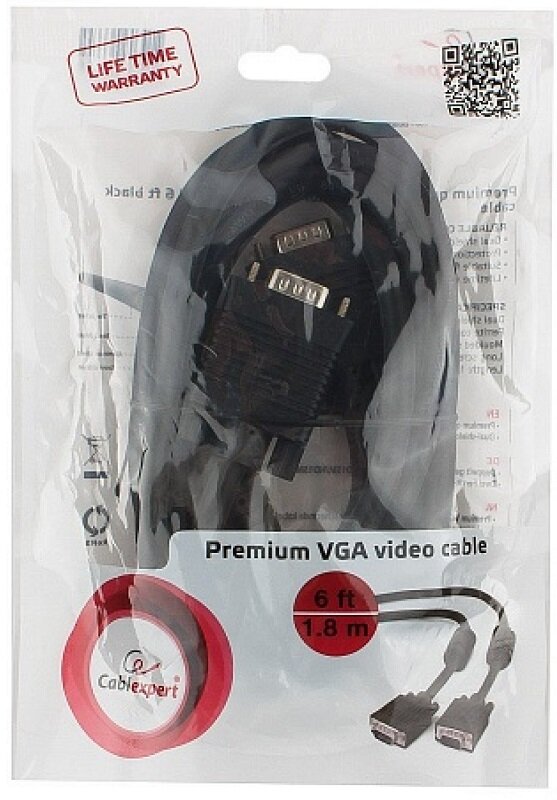 Кабель VGA Premium Cablexpert, 1.8м, 15M/15M, тройн.экран, феррит.кольца, пакет (CC-PPVGA-6)