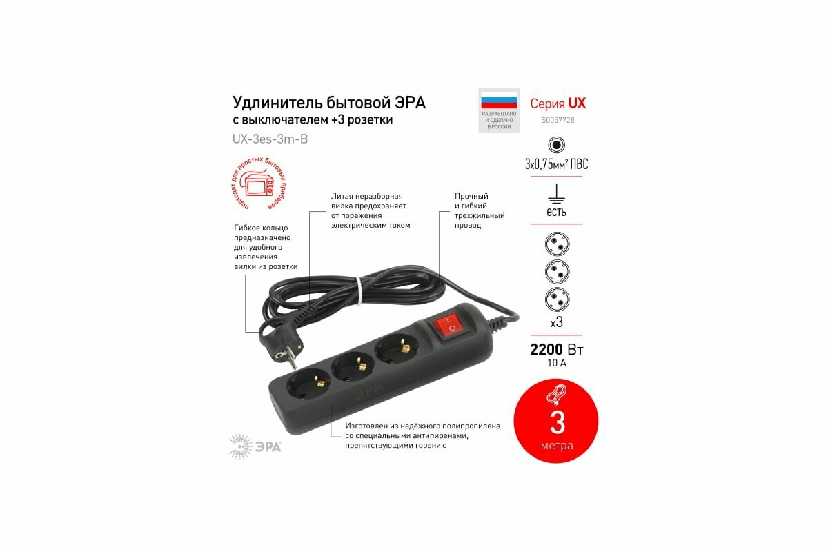Удлинитель ЭРА UX-3es-3m, 3 розетки, с/з, 10А / 2200 Вт черный 3 м