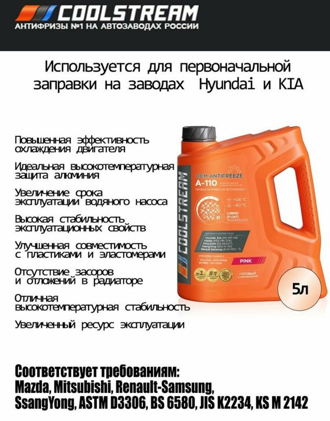 | Отзыв: | На мой взгляд Coolstream A-110 - это лучший антифриз для корейцев. Присадки импортные, корейские. Цена-качество на уровне. Рекомендую! |